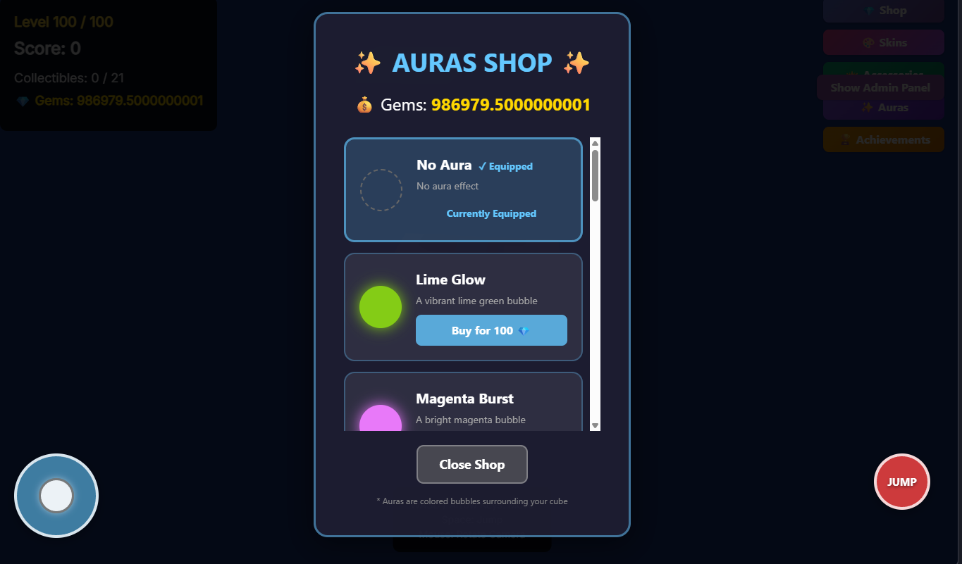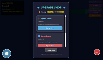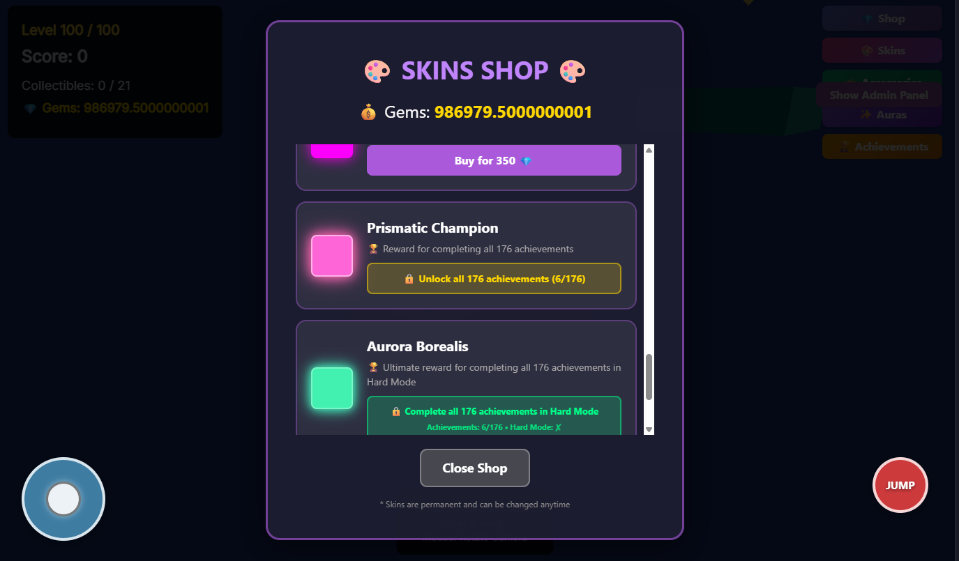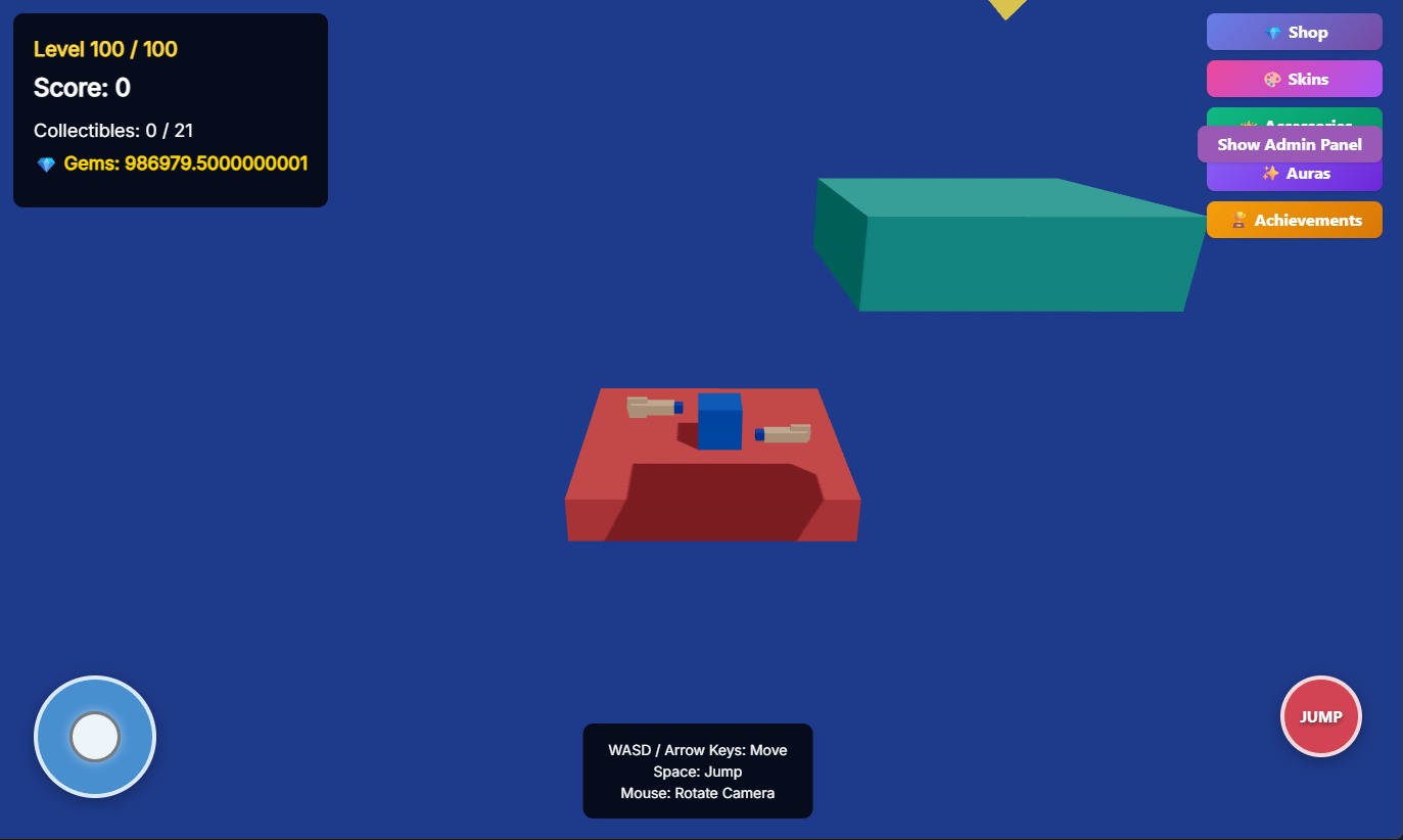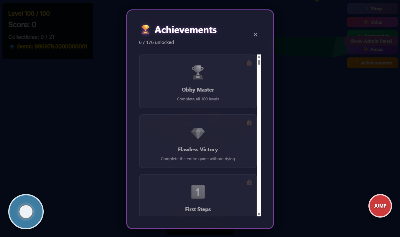 Obby3d is a fun platformer game with gems,tons of levels, and multiple modes. Gems can be used to buy accesories,skins,auras,and upgrades. Please share this game with your friends and give feedback. There are also achievements which can help get exclusive skins.